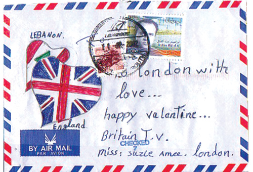 This cover is interesting in more ways than one. It was sent by a gallant soul rather infatuated with British actress Susie Amy. The airpost cover is addressed to “Britain TV, Miss Suzie Amee, London—a rather vague address to be sure, and without postal code. At the time this valentine was sent, Ms. Amy (note the spelling of the actress’ name on the cover is incorrect) was starring in a British Broadcasting Corporation (BBC) television show called “Footballers’ Wives”.