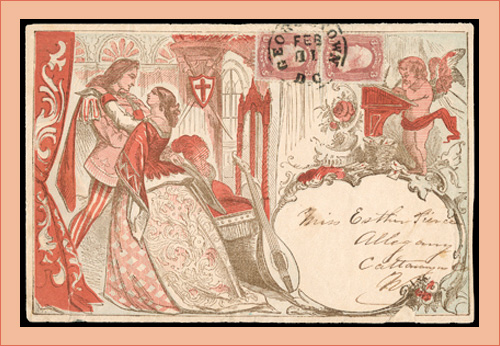 Finally, we find a very different, idealistic rendition of the War, a large allover valentine design cover to Allegany, N.Y., with a vertical pair of the 3¢ Rose (Sc. 65) tied by a “Georgetown, D.C./Feb 11” datestamp.