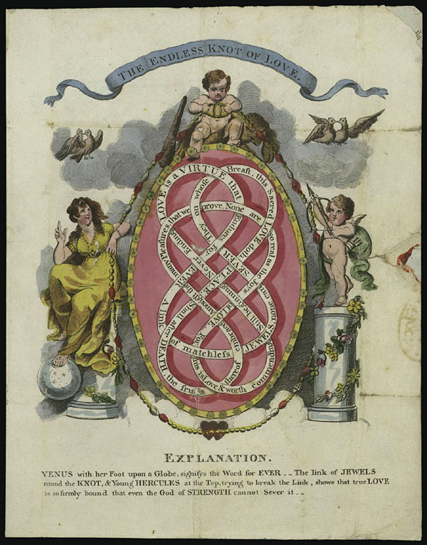 This is one of the more interesting designs, an 1814 hand-colored lettersheet with printed design titled “The Endless Knot of Love” with a printed verse woven through the design and at the bottom, also with metal sequins sewn around the oval. It was sent from a Royal Marine sergeant from Woolwich to Cambridge.